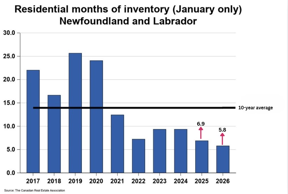 Months of inventory numbered 5.8 at the end of January 2026, down from the 6.9 months recorded at the end of January 2025 and below the long-run average of 13.9 months for this time of year. The number of months of inventory is the number of months it would take to sell current inventories at the current rate of sales activity.